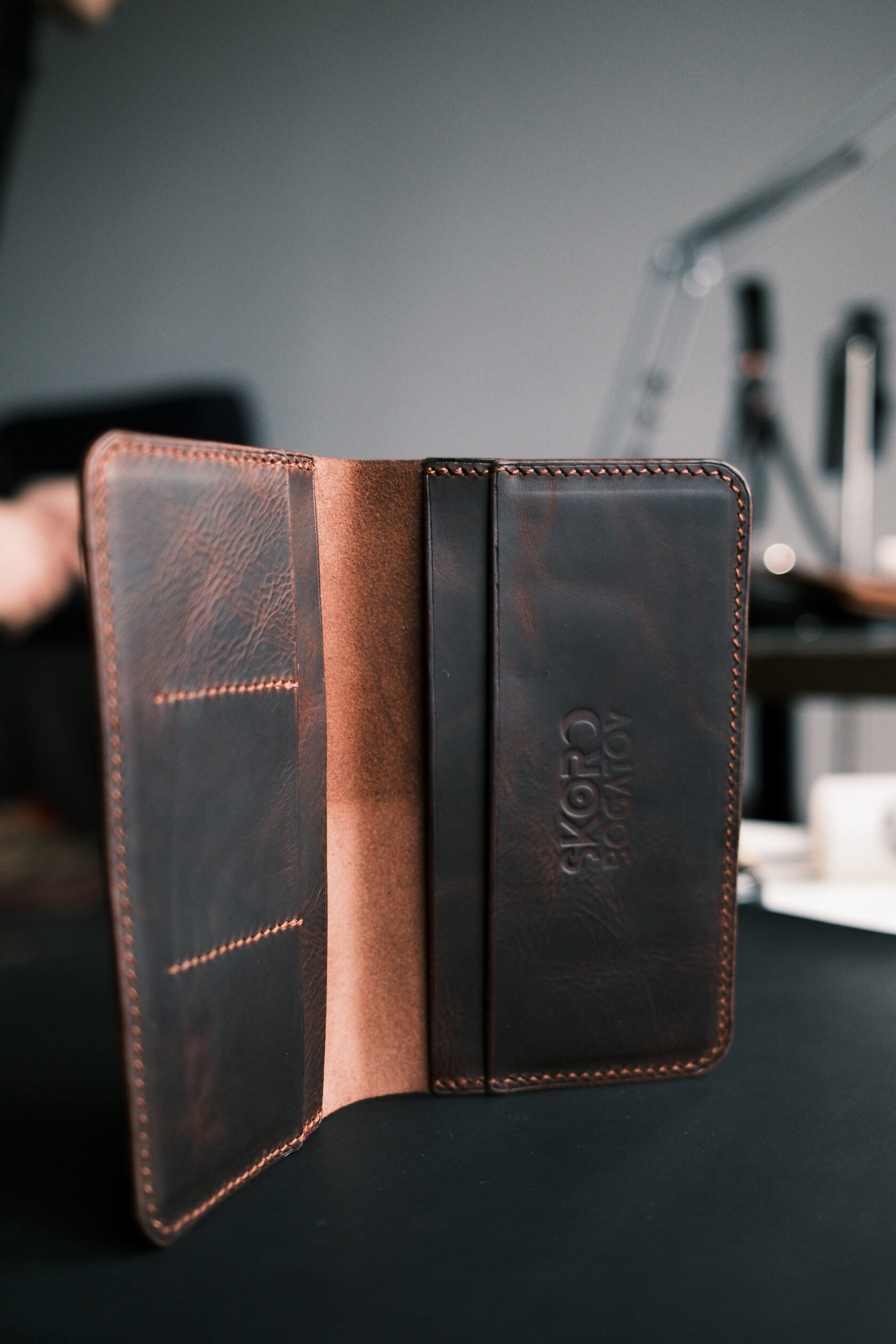 Буквально - держатель документов. При изготовлении использовался только ручной инструмент: шило, нож, пробойники, киянка и пара игл. Каждый стежок выполнен седельным швом - самым крепким, разорвать такой невозможно.